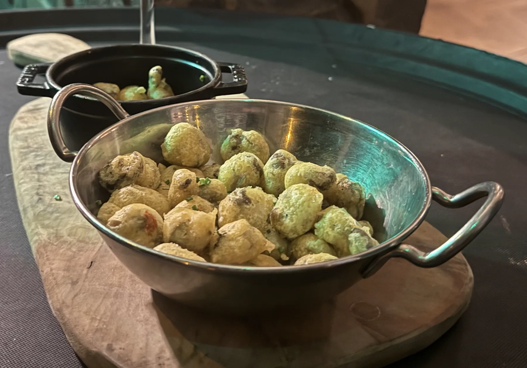Við fengum auðvitað að smakka herlegheitin. Hér eru þeir bornir fram djúpsteiktir í tempuradeigi og smökkuðust afar vel. Erfitt að segja hverju kjötið líkist, mætti helst segja kolbrabba eða slíku. Hópurinn sauð sniglana sjálfur og pillaði úr skelinni áður en þeir voru matreiddir.
