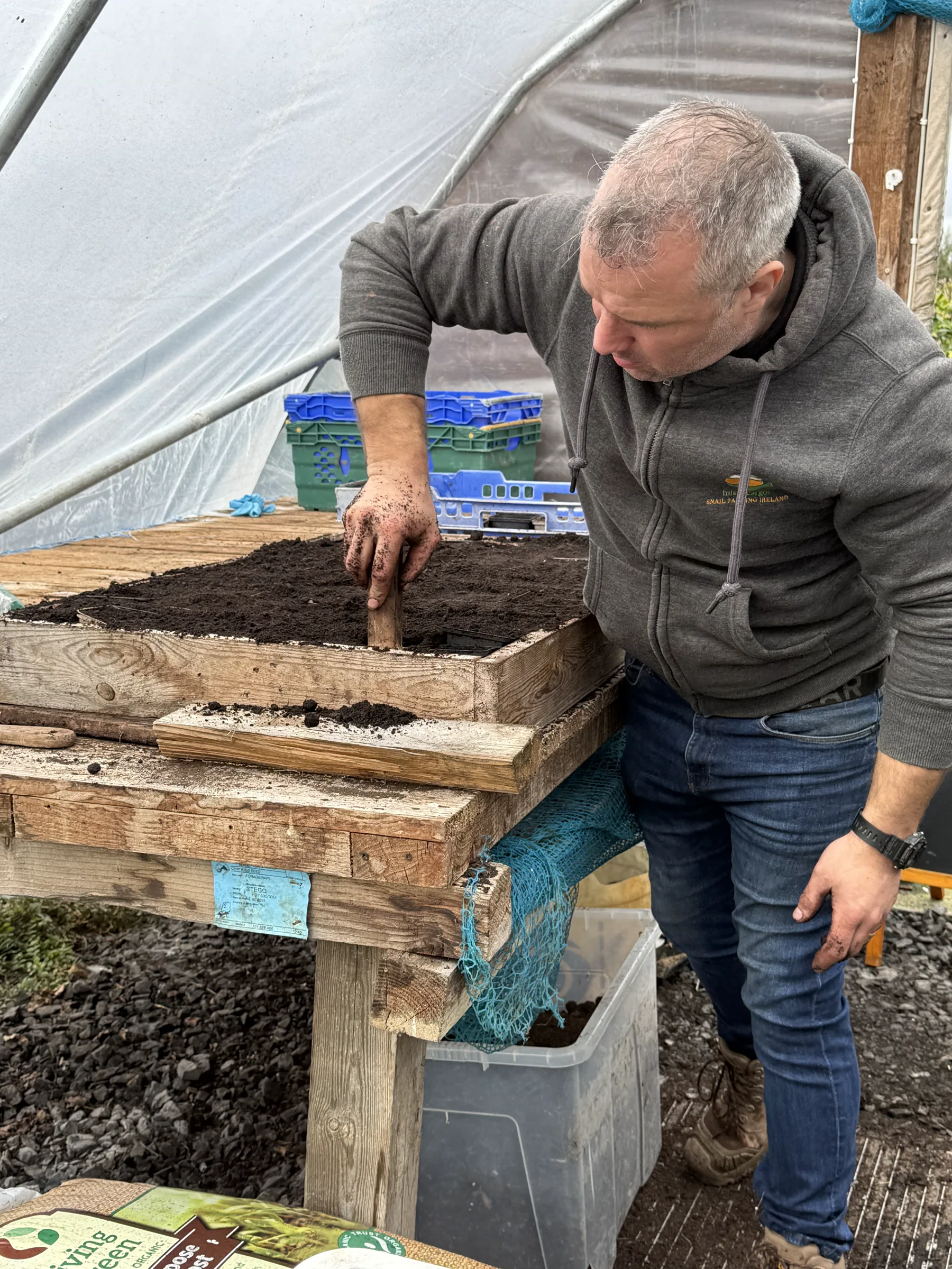 Peter hefur þróað sínar aðferðir í öllum skrefum framleiðslunnar með það fyrir augu að fækka handtökum. Hér þjappar hann mold í pottana sem sniglarnir svo verpa eggjum sínum í.