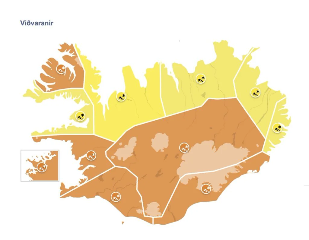 Appelsínugul viðvörun tekur gildi á höfuðborgarsvæðinu, Suðurlandi, Faxaflóa og miðhálendinu í morgunsárið en gular viðvaranir verða í öðrum landshlutum.