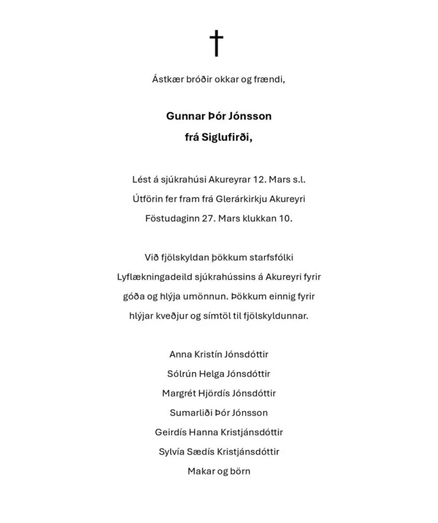 Gunnar Þór Jónsson frá Siglufirði er látinn. Hann lést á Sjúkrahúsinu á Akureyri þann 12. mars síðastliðinn.