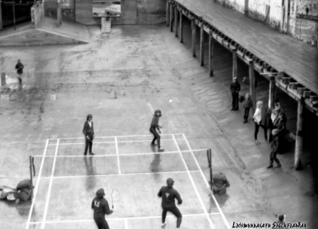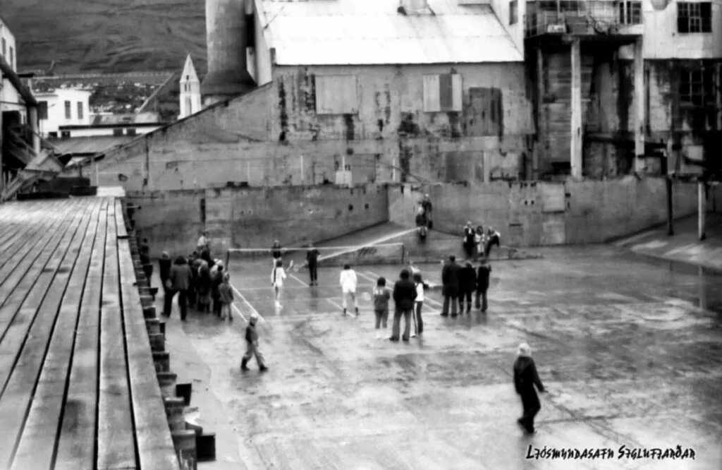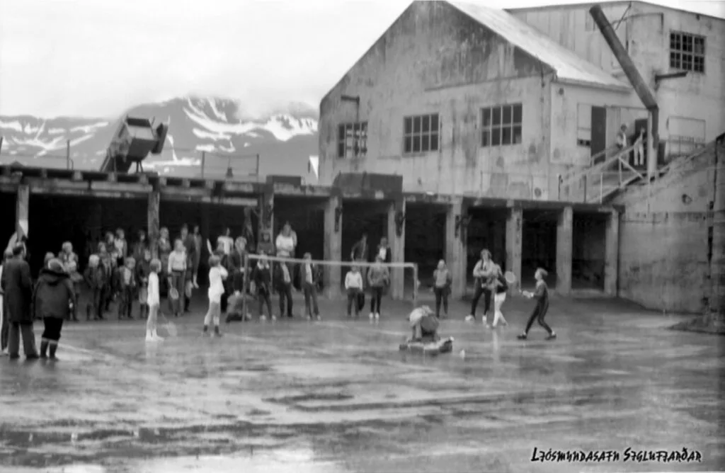 Á forsíðu ljósmyndinni sjáum við ungmenni frá Tennis og badmintonfélagi Siglufjarðar, (TBS) keppa í badminton á heimatilbúnum velli, í hinni svokölluðu, SR 30 síldarþró. Þetta var líklega lang stærsta síldarþró Íslands og pistlahöfundur á sér minningar um að hafa spilað þar bæði fótbolta og handbolta. Hér birtast ykkur minningar um síldarverksmiðjur og 35 myndir um íþróttaiðkun og aðstöðuleysi í einangruðu bæjarfélagi á norðurhjara veraldar á síðustu öld.