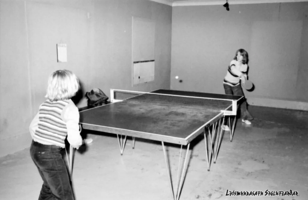 Myndirnar eru líklega teknar í byrjun 1970 og að sjálfsögðu snýst þetta um aðstöðuleysi á Siglufirði yfir sumartímann, því þá breyttist Sund / Íþrótta-höll Siglufjarðar í 25 metra innanhúss sundlaug. Lengi vel var það einungis pínulítill leikfimissalur Barnaskóla Siglufjarðar sem gat hýst innanhúss íþróttir allt árið.
