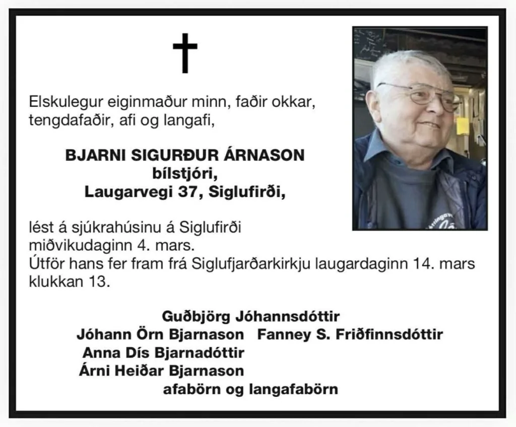 Útför Bjarna fer fram frá Siglufjarðarkirkju laugardaginn 14. mars klukkan 13.